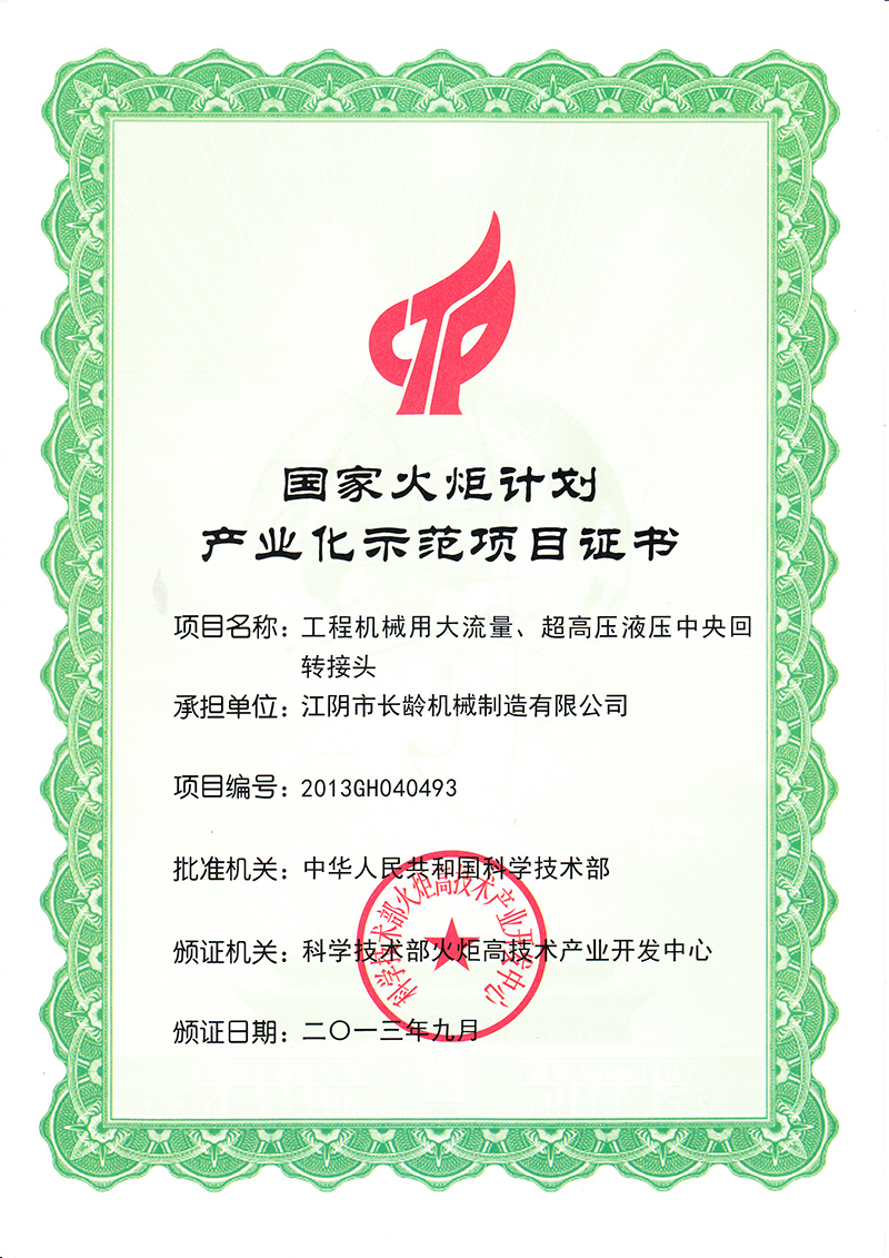 國(guó)家火炬示范項(xiàng)目證書(大流量超高壓接頭)